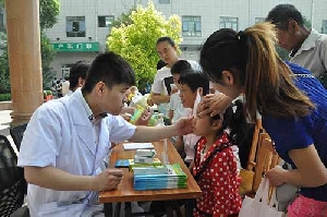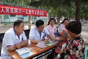 6月1日,市中心人民醫(yī)院醫(yī)生正為一兒童檢查身體。當天,該院組織兒科醫(yī)務人員走上街頭,向過往市民宣傳健康知識,并免費為兒童診療。