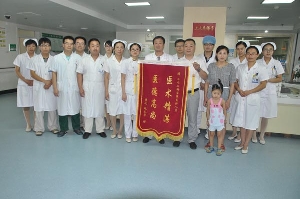 8月5日,28歲的魯化職工趙本華在家人的陪同下,將一面繡有 “醫(yī)術(shù)精湛 醫(yī)德高尚”的錦旗送到市中心人民醫(yī)院心內(nèi)二科,趙本華握著郭明主任的雙手,熱淚盈眶,激