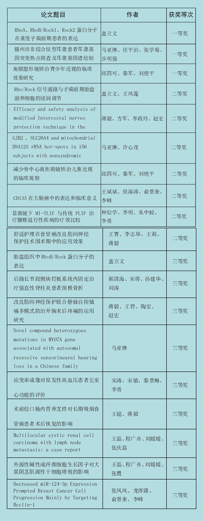 近期,由棗莊市人力資源和社會(huì)保障局、市財(cái)政局、市學(xué)科技術(shù)協(xié)會(huì)聯(lián)合組織開(kāi)展了棗莊市第十九屆自然科學(xué)優(yōu)秀學(xué)術(shù)成果獎(jiǎng)評(píng)選活動(dòng),我院共有19篇論文獲此殊榮。在此次論文評(píng)選活動(dòng)中,我院共榮獲一等獎(jiǎng)3項(xiàng),二等獎(jiǎng)7項(xiàng),三等獎(jiǎng)9項(xiàng)。(科教科 王晶)