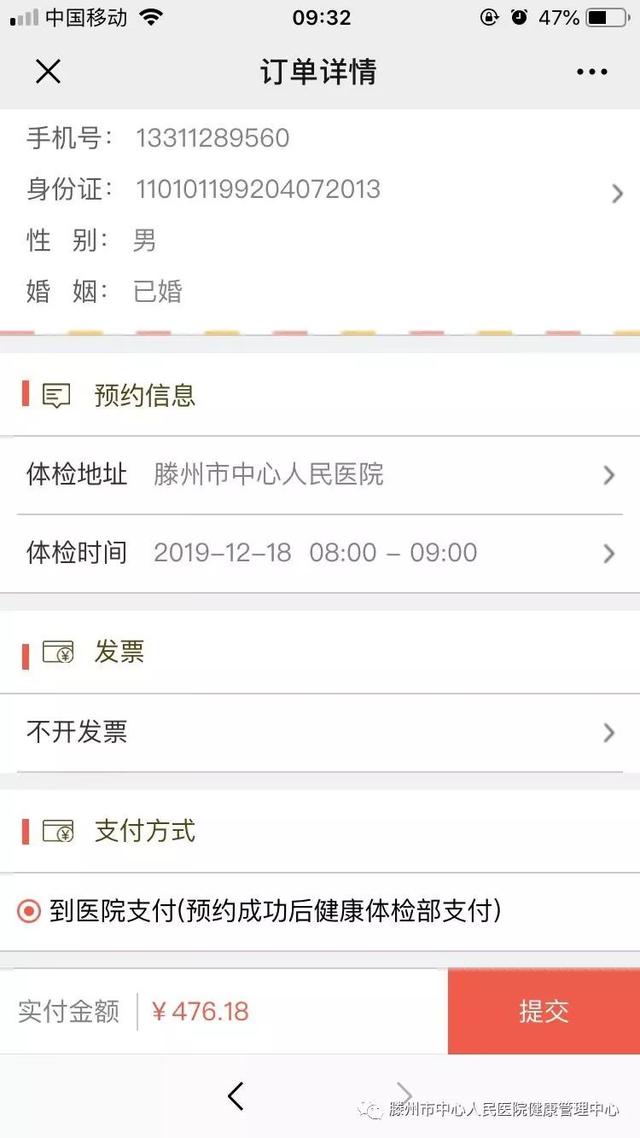 05添加體檢人,選擇體檢地址和時(shí)間后點(diǎn)擊“提交”