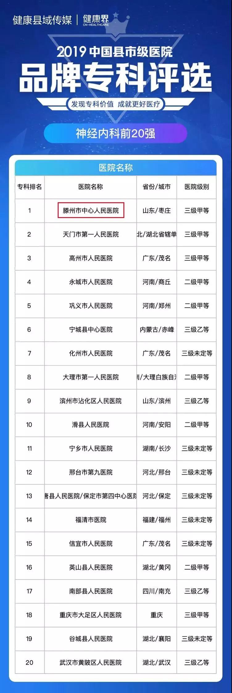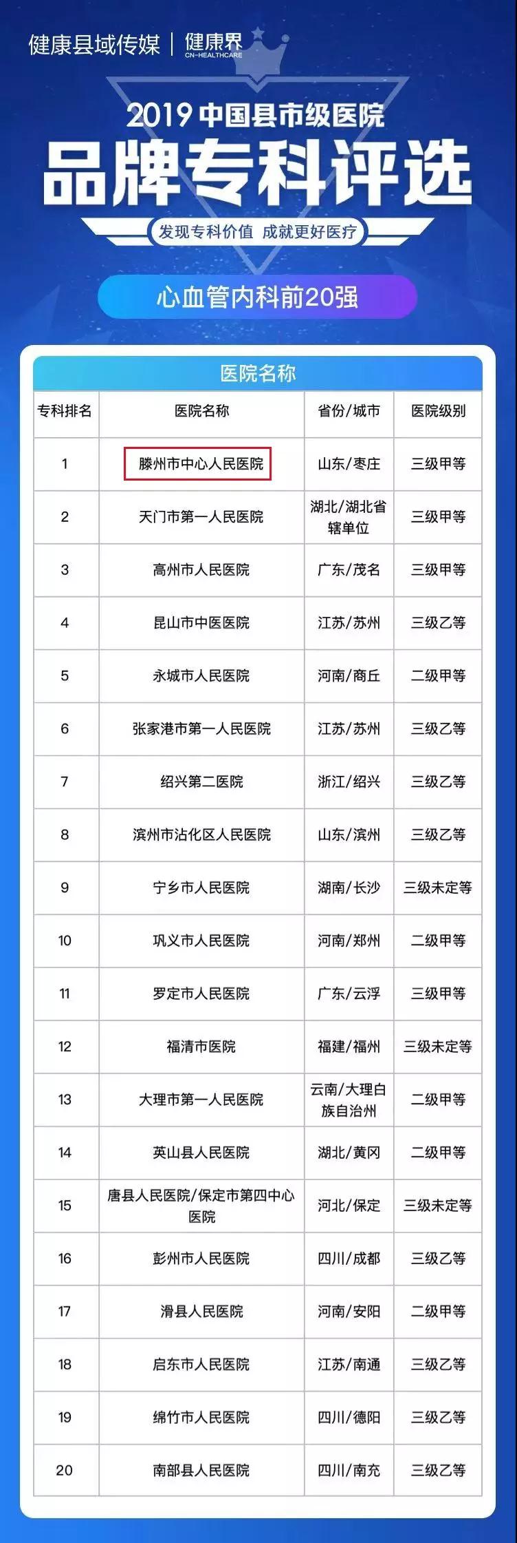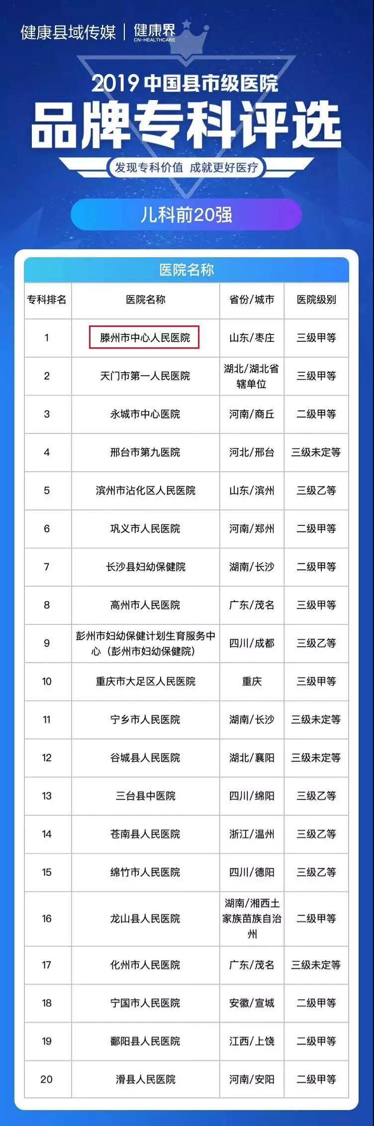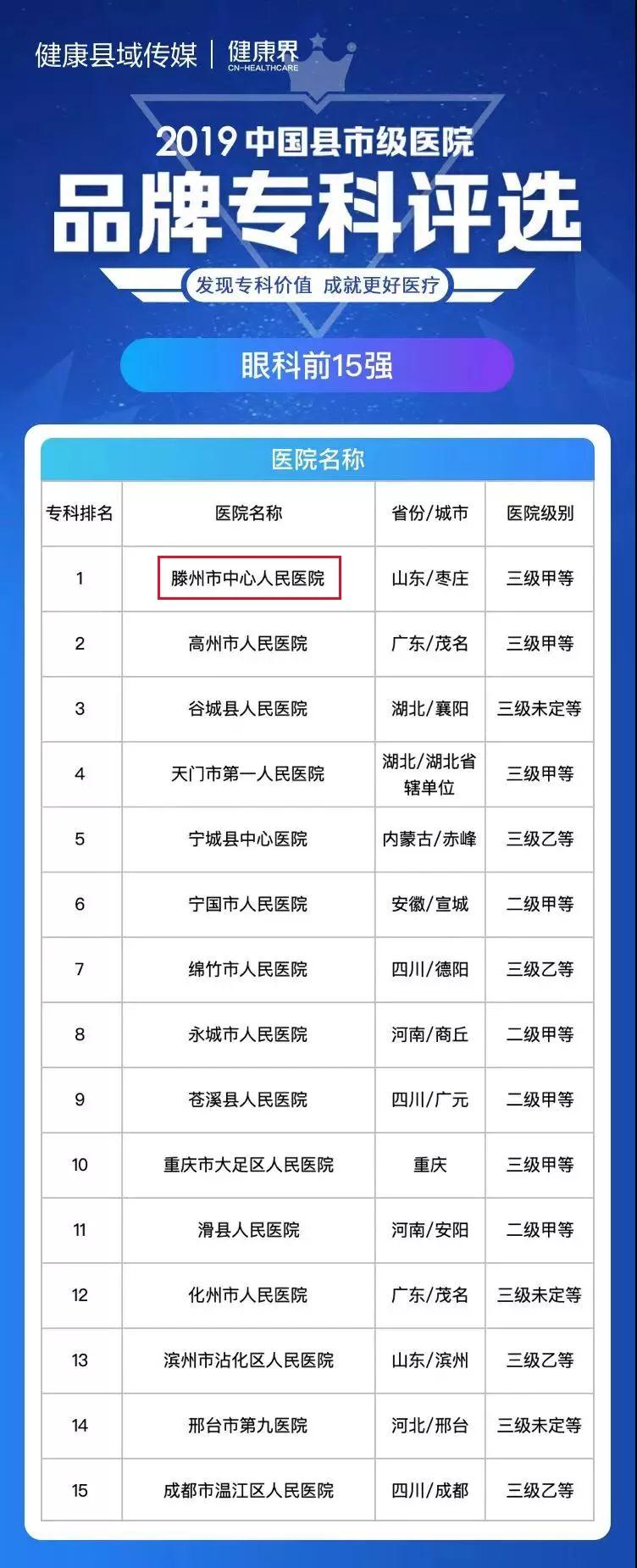 近日,經(jīng)過線上評選、入圍初評、專家終審等環(huán)節(jié),滕州市中心人民醫(yī)院心血管內(nèi)科、神經(jīng)內(nèi)科、兒科、腫瘤科、眼科在所參評的??婆琶?,均拔得頭籌;婦產(chǎn)科、呼吸內(nèi)科、內(nèi)分泌科位居第2名;消化內(nèi)科位居第3名;骨科、耳鼻咽喉科、泌尿外科位居第4名;普外科和急診科分別位列第6和第18名。