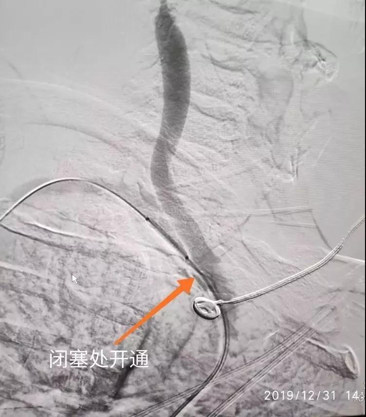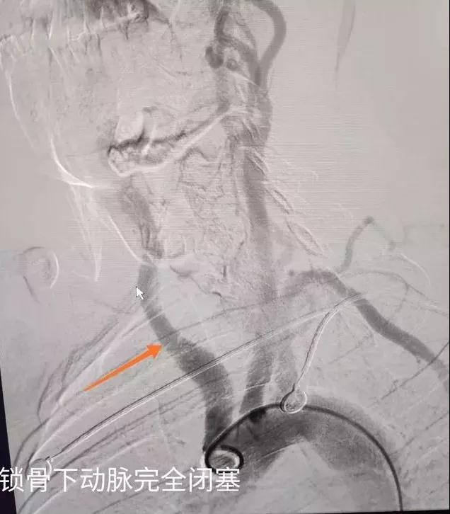 馬磊副主任醫(yī)師再次提出,可以用導(dǎo)絲硬頭開通。經(jīng)過馬主任多次嘗試,終于成功開通完全閉塞的右側(cè)鎖骨下動脈!