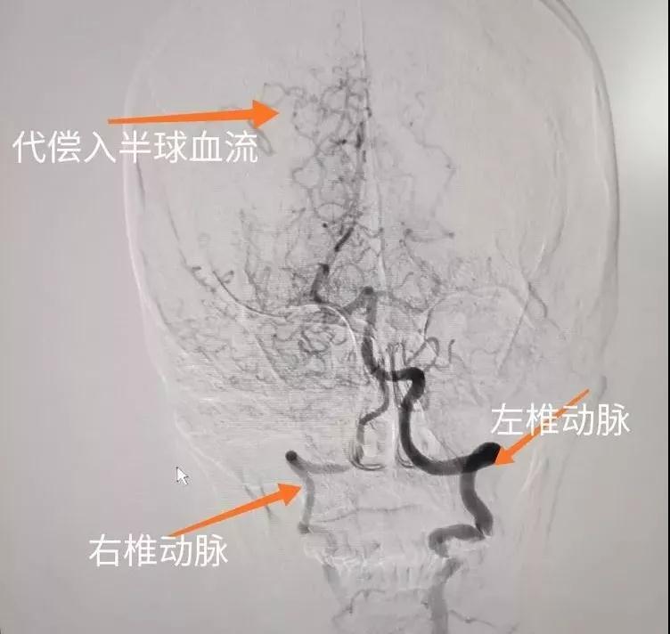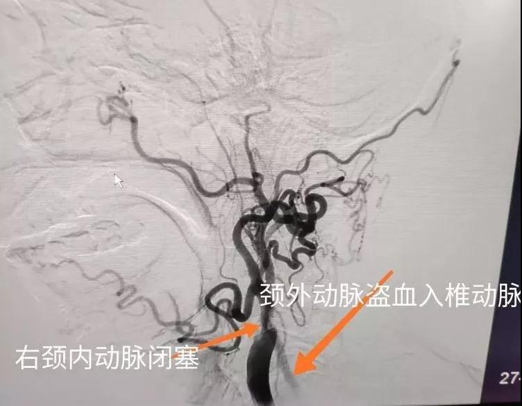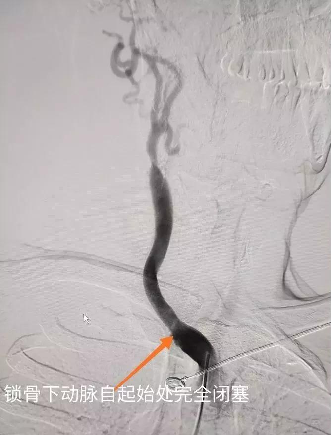 患者行腦血管造影后,發(fā)現(xiàn)右鎖骨下動脈慢性完全閉塞,右頸內(nèi)動脈完全閉塞,右頸外動脈及左椎動脈代償右椎動脈血流,右頸內(nèi)動脈血流緊靠左椎動脈部分代償供血。如不及時開通右鎖骨下動脈,患者腦供血無法改善,有造成偏癱及昏迷風(fēng)險!