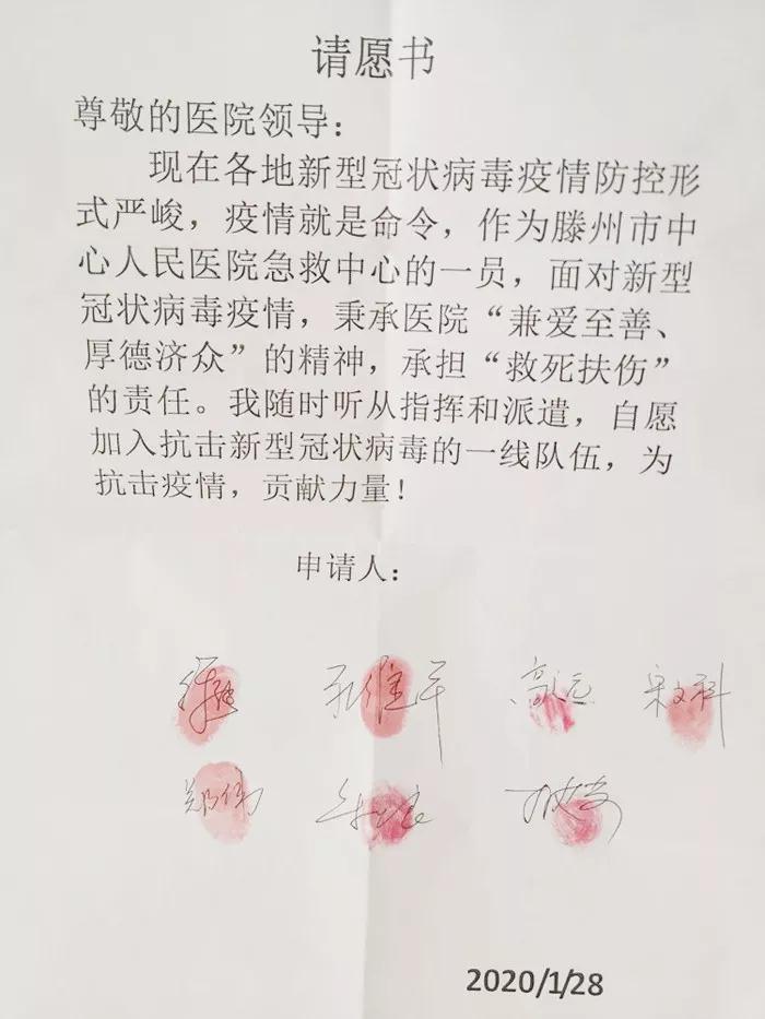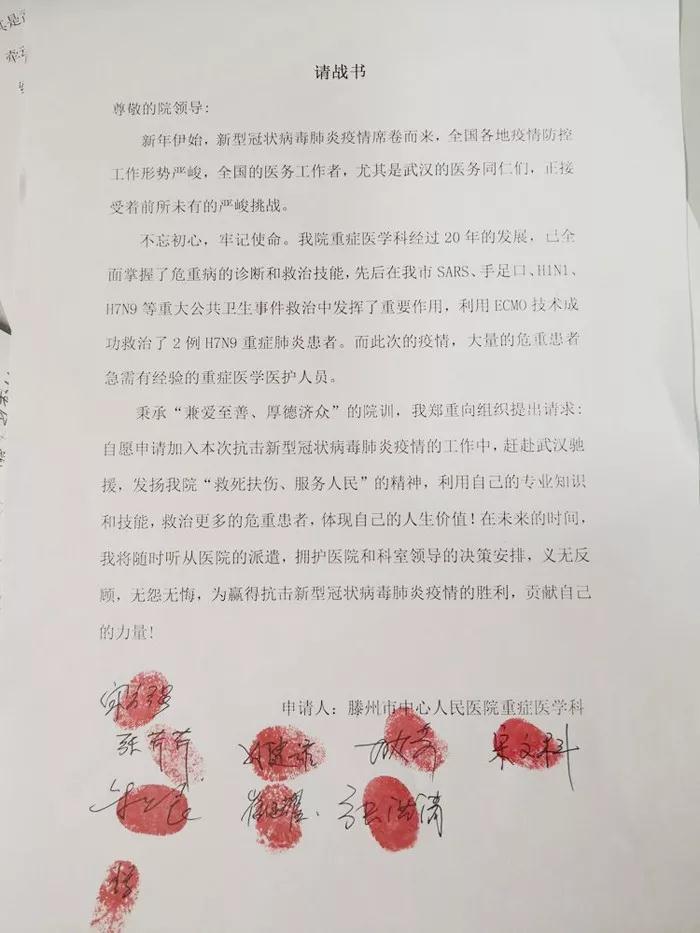 1月25日,大年初一,科主任宋方強(qiáng)牽頭帶領(lǐng)ICU的勇士們自發(fā)簽署了“請(qǐng)戰(zhàn)書(shū)”,堅(jiān)持共產(chǎn)黨員的“不忘初心、牢記使命”,發(fā)揚(yáng)院訓(xùn):兼愛(ài)至善,厚德濟(jì)眾。ICU醫(yī)護(hù)人員鄭重向組織提出請(qǐng)求,自愿申請(qǐng)加入此次抗擊新型冠狀病毒肺炎疫情工作中,趕赴武漢疫區(qū)馳援,義無(wú)反顧、無(wú)怨無(wú)悔,為抗擊新型冠狀病毒肺炎疫情的勝利,貢獻(xiàn)自己的力量。