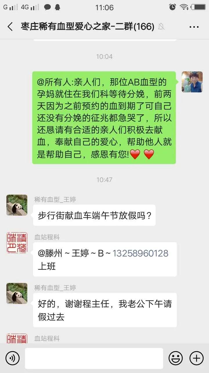 此時(shí),棗莊血站程科長(zhǎng)已在稀有血型大家庭里呼吁RH陰性AB型血的家人積極獻(xiàn)血,我院輸血科也在積極的籌備中,每天早交班,同事們問(wèn)的第一句話就是“稀有血型備上了嗎?”在此期間,我們嚴(yán)密觀察著該孕婦的產(chǎn)程進(jìn)展情況。一天,看著她在病房里偷偷抹眼淚,我上前安慰了幾句,我知道她擔(dān)心什么??慈豪餂](méi)有AB型血的家人去獻(xiàn)血,于是我在群里說(shuō)了一下該孕婦的情況,再次呼吁有合適的家人去獻(xiàn)血。消息剛一發(fā)出,就有兩位同血型的家人前去獻(xiàn)血。讓人感動(dòng)的是一位家人專(zhuān)門(mén)請(qǐng)假去獻(xiàn)血,在此感謝您們!