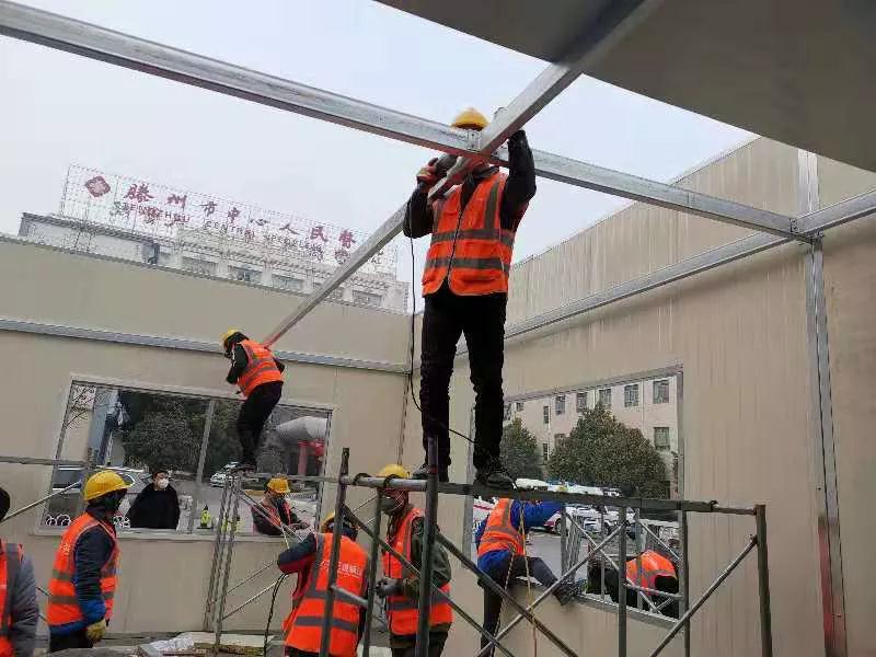 為更好應(yīng)對(duì)疫情防控工作,滕州市新型冠狀病毒感染肺炎疫情防控工作領(lǐng)導(dǎo)小組決定在滕州市中心人民醫(yī)院盡快建設(shè)發(fā)熱門診候診區(qū)。疫情就是命令,時(shí)間就是生命。滕州市中心人民醫(yī)院接到命令后,在現(xiàn)有發(fā)熱門診基礎(chǔ)之上立即啟動(dòng)發(fā)熱門診候診區(qū)擴(kuò)建工程。從設(shè)計(jì)建設(shè)到任務(wù)完成,醫(yī)院在山東三維鋼結(jié)構(gòu)股份有限公司的大力支持下,僅用了36個(gè)小時(shí)將近150平方的發(fā)熱門診候診區(qū)建設(shè)完畢。