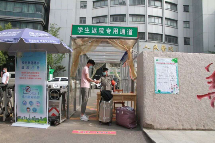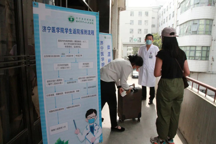 6月28日上午,濟(jì)寧醫(yī)學(xué)院2016級(jí)臨床醫(yī)學(xué)專業(yè)7班吉林籍學(xué)生王蘇萍發(fā)來(lái)微信:“老師,我是今年新一屆的實(shí)習(xí)生,大約8點(diǎn)30分到達(dá)醫(yī)院”。班長(zhǎng)程永政是山東省內(nèi)學(xué)生,原計(jì)劃應(yīng)在6月30日第三批次返院,但為了協(xié)助同學(xué)來(lái)滕實(shí)習(xí),提前和王蘇萍同學(xué)一同到達(dá)。接到這兩名學(xué)生信息后,早已等候多時(shí)的醫(yī)院工作人員,立即按照醫(yī)院制定的學(xué)生返院工作方案,各司其責(zé),做好各項(xiàng)迎接準(zhǔn)備工作。