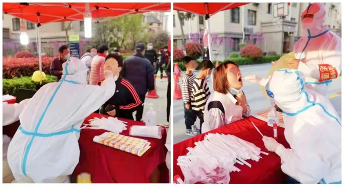 4月8日,由于疫情更加嚴峻,李賓及朱伯會醫(yī)生緊急被派至封控區(qū)、管控區(qū)參加緊急診療任務。科室前后有9名護士投入到全民核酸采集工作。大家每天不到5:00就出發(fā),6:00開始工作,為了節(jié)約防護物質及時間,連續(xù)工作,中間不吃飯,不喝水,每日采樣達數(shù)千人。?