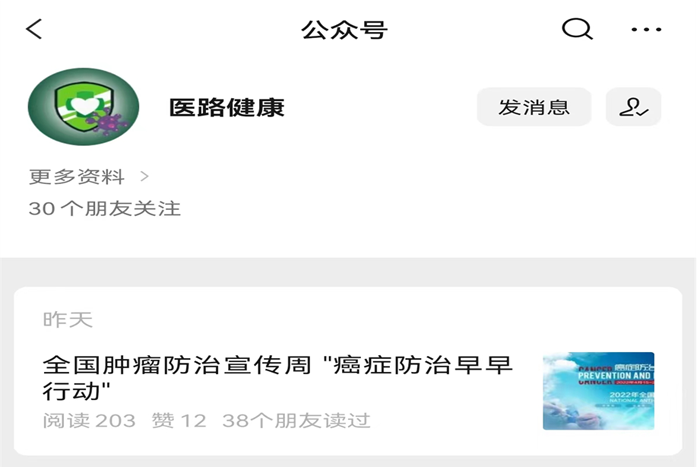 青年醫(yī)生發(fā)揮黨員先鋒模范作用,充分利用科室微信公眾號“醫(yī)路健康”作為載體平臺,推送腫瘤防治知識幻燈片,病友講座相關(guān)視頻,獲得了讀者的互動反饋,對患者及高危人群的居家醫(yī)療起到了重要的橋梁作用。