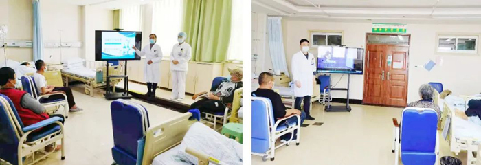 另外,腫瘤三科還舉辦了線下專業(yè)知識學(xué)術(shù)講座。在疫情防控常態(tài)化模式下,移動式平板穿梭于科室病房內(nèi),進行了線下腫瘤防治知識講座。講座由呂民主管護師主持,孫士清醫(yī)生等多位醫(yī)護人員參與。講座就腫瘤的定義、病因、分類等方面做了詳細的闡述,并就國內(nèi)外專家共識作了詳細的介紹和比較。本次講座內(nèi)容實用性強,分病房、分病種、按需求、針對性強,參會人員均表示受益良多。