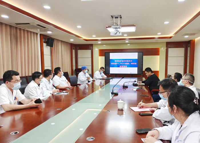 接下來,核醫(yī)學(xué)科負責人關(guān)祥禎作題為“精準醫(yī)療核你同行”的專題報告,就核醫(yī)學(xué)科開展的各類診療項目做簡要介紹,并分享部分典型案例。與會人員踴躍發(fā)言,胸外科主任趙宏、腫瘤三科主任李苓就個人臨床經(jīng)驗暢談了PET/CT在腫瘤患者、發(fā)熱原因不明患者中的應(yīng)用價值,認為獲益很大,價值很高;消化科主任李曙暉從專業(yè)角度出發(fā),闡述了胃幽門螺旋桿菌根治的重要價值,提議核醫(yī)學(xué)科加強14C呼氣試驗質(zhì)控,盡早開展13C檢查,方便患者;內(nèi)分泌一科副主任王開芹詢問了我院核素病房建設(shè)進度,建議盡早開診;內(nèi)分泌二科副主任于軍霞探討了甲狀腺顯像和131I治療輻射劑量的問題;血液科主任張奎對PET/CT的價值給予高度肯定,并給出淋巴瘤患者PET/CT報告可增加肝臟和縱隔血池SUV值的建議。與會其他代表就檢查單開具細節(jié)、預(yù)約檢查流程、患者適應(yīng)癥等問題進行了討論。