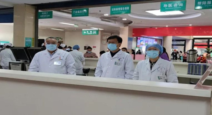 10月19日,院黨委委員、紀(jì)委書(shū)記趙逢平帶領(lǐng)相關(guān)職能部門(mén)負(fù)責(zé)人,在門(mén)診導(dǎo)診臺(tái)值班,零距離服務(wù)患者,落實(shí)投訴閉環(huán)管理。(門(mén)診部)