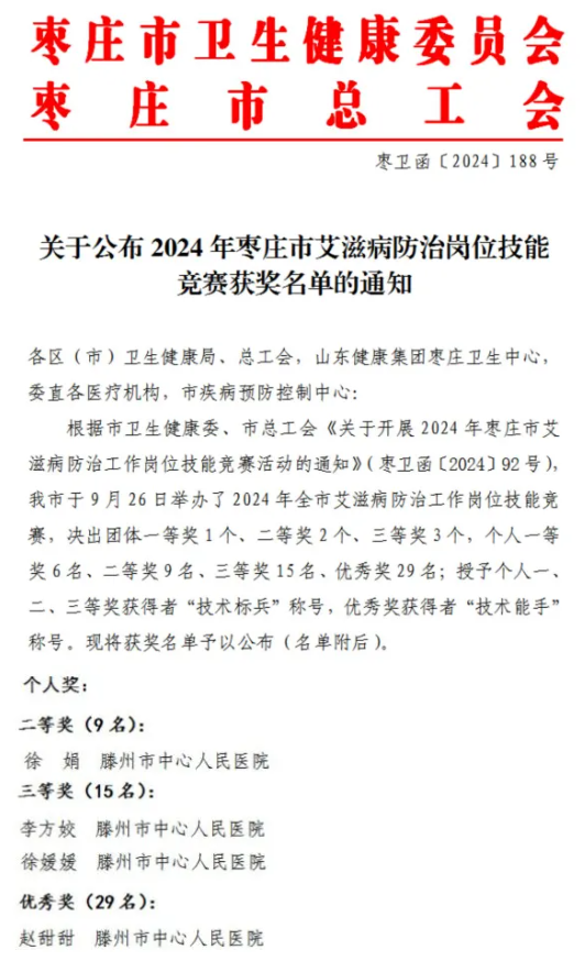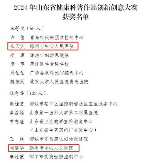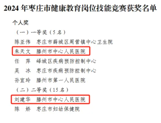 我院共318名醫(yī)務(wù)人員參賽,榮獲滕州市級一等獎20人、二等獎35人、三等獎52人、優(yōu)秀獎89人。其中,6人通過滕州市級健康教育和艾滋病防治技能競賽選拔,參加棗莊市及山東省競賽。足踝外科朱天文和婦科劉建華在棗莊市健康教育崗位技能競賽分獲一等獎和二等獎,并代表棗莊市參加山東省健康科普作品創(chuàng)新創(chuàng)意大賽,榮獲三等獎和優(yōu)秀獎。