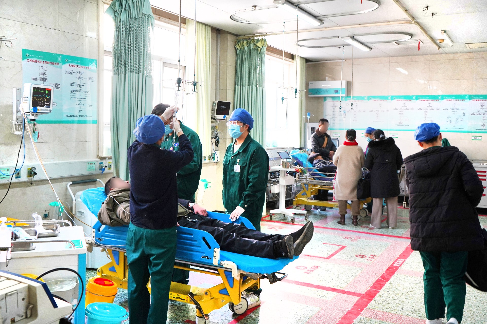 春節(jié)期間,各類突發(fā)疾病和意外事故并未因節(jié)日而減少。門診大廳,導(dǎo)醫(yī)臺的工作人員面帶微笑,耐心解答患者的每一個疑問;分診護士們在人群中穿梭,有條不紊地維持著就診秩序;診室里,醫(yī)生們仔細詢問患者的病情,給出專業(yè)的診療建議;吸氧、監(jiān)護、心肺復(fù)蘇……急診室里一場又一場緊張有序地搶救不斷上演。