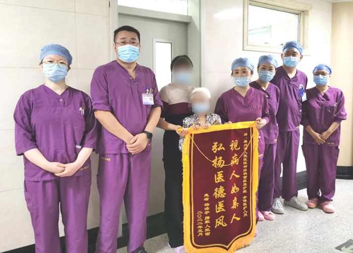 術(shù)后,患兒轉(zhuǎn)入神經(jīng)重癥監(jiān)護(hù)室對(duì)癥治療、專業(yè)護(hù)理。因患兒年齡小、心理恐懼,科室護(hù)理團(tuán)隊(duì)像媽媽一樣無(wú)微不至地照顧、安撫、鼓勵(lì)患兒。經(jīng)過(guò)醫(yī)護(hù)團(tuán)隊(duì)悉心的照料,患兒次日便順利脫掉呼吸機(jī)、拔除氣管插管。轉(zhuǎn)入普通病房前,患兒意識(shí)清醒,言語(yǔ)對(duì)答清楚,肢體活動(dòng)正常?;純涸诩覍俚呐阃拢H手將錦旗送到李肖穎護(hù)士長(zhǎng)手中。(神經(jīng)重癥監(jiān)護(hù)室) ?