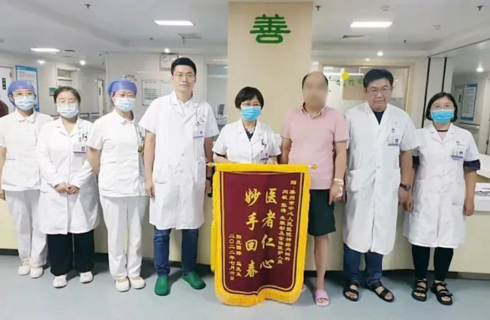 7月7日,一位蛛網(wǎng)膜下腔出血康復(fù)出院的患者,將一面寫有“醫(yī)者仁心、妙手回春”的錦旗送到神經(jīng)內(nèi)四科病房。