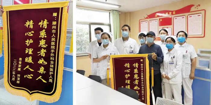 一大早,患者家屬羿先生將一面寫(xiě)有“精心護(hù)理暖人心,情系患者如親人”的錦旗,送到手外科主任高學(xué)柱和護(hù)士長(zhǎng)楊列美手中,感謝所有醫(yī)護(hù)人員對(duì)患者的照護(hù)。