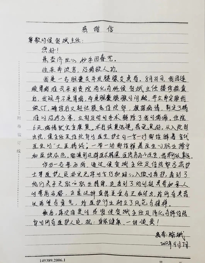 拳拳感恩心,暖暖醫(yī)患情。近日,我院醫(yī)德醫(yī)風(fēng)辦收到一封患者親筆寫給侯賀斌醫(yī)生的感謝信,來(lái)信照登如下。