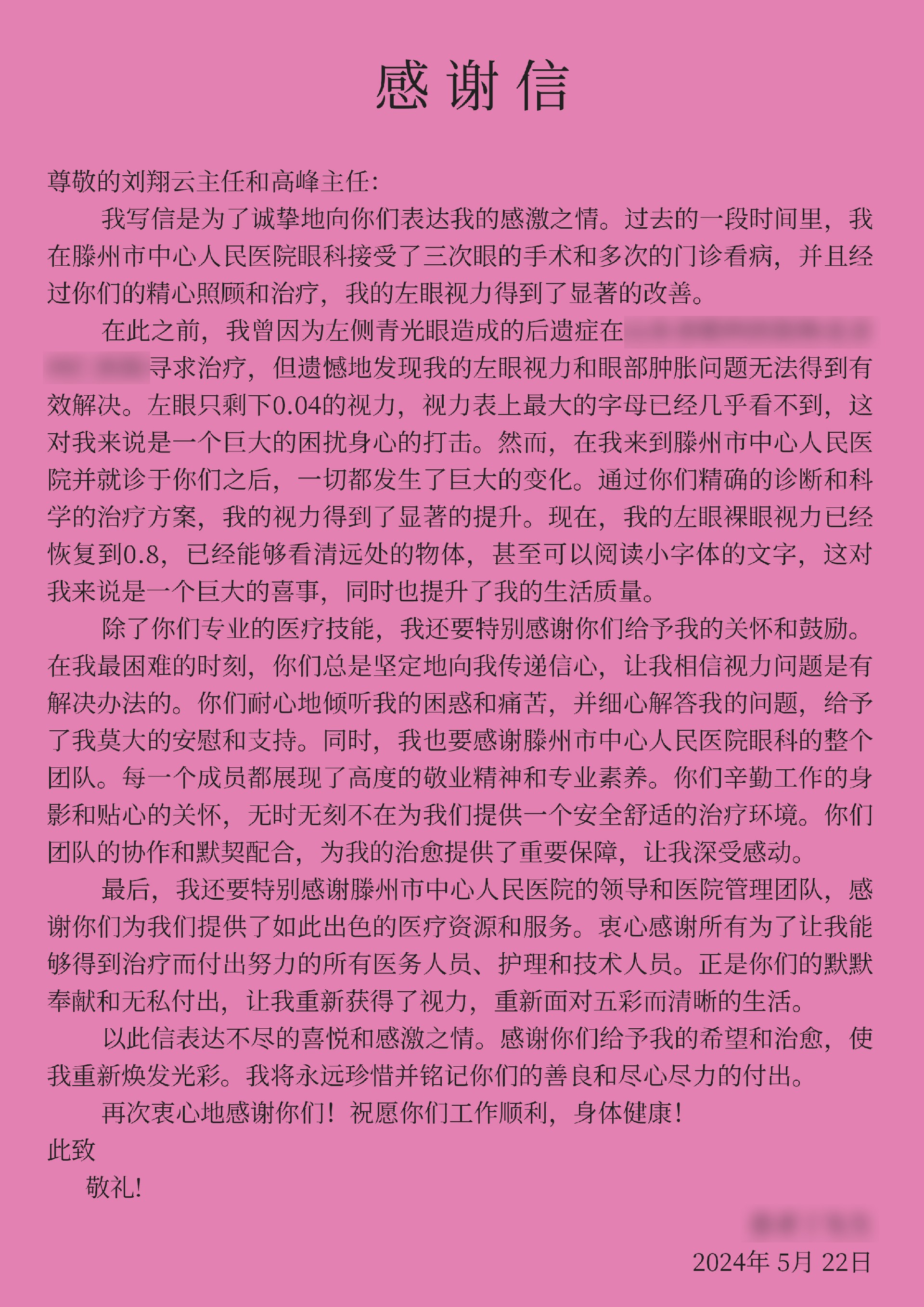 近日,眼科門診,一位七歲女童在父母的陪伴下,將一面寫有“醫(yī)德高尚暖人心,溫暖患者如家人”的錦旗送到王皓月主任和王雪蓮護(hù)士手中,以表達(dá)對她們精湛醫(yī)術(shù)和貼心服務(wù)的深深感激。