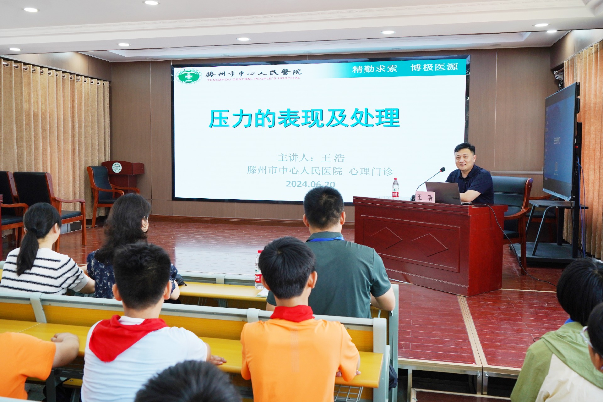 在學(xué)校禮堂,心理門診王浩醫(yī)生為孩子們帶來了生動(dòng)有趣的心理健康講座《壓力相關(guān)表現(xiàn)及處理》。通過講解壓力的來源,面對(duì)考試時(shí)學(xué)生的高喚起水平、低喚起水平對(duì)成績(jī)的影響,以及情緒的察覺、接納、允許、轉(zhuǎn)化和升華的過程,讓孩子們?cè)谳p松愉快的氛圍中學(xué)會(huì)了自我情緒的識(shí)別,應(yīng)用“著陸技術(shù)”“手勢(shì)技術(shù)”“蝴蝶抱”等實(shí)用有效的方法及時(shí)調(diào)整自己的壓力反應(yīng)。