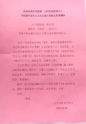 尊敬的滕州市中心人民醫(yī)院泌尿外一科全體醫(yī)護(hù)人員:你們好!你們辛苦了!首先我和家人對(duì)你們表示衷心的感謝和崇高的敬意,祝愿你們好人一生平安。在貴院治病的日子里,我深深地感受到貴院“病人至上”的服務(wù)標(biāo)準(zhǔn),你們的服務(wù)讓我有種溫暖的感覺,也讓我倍感親切?;颊咝祜w鴻因遭遇交通意外,情況危急,當(dāng)?shù)蒯t(yī)院建議轉(zhuǎn)院,