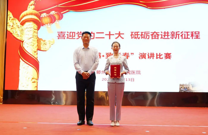 滕州市委宣傳部分管日常工作的副部長李長瑞,滕州市委市直機(jī)關(guān)工委書記丁新亞,滕州市總工會黨組書記、常務(wù)副主席張永正,滕州團(tuán)市委書記劉彥宏,滕州市婦聯(lián)黨組書記、主席張弘,滕州市衛(wèi)健局黨組成員、直屬機(jī)關(guān)黨委書記顏紅菊,滕州市融媒體中心總編輯李衛(wèi)東,我院黨委書記邢佑文,院黨委副書記、院長武宗義,院領(lǐng)導(dǎo)班子成員及院中層干部,入黨積極分子,青年醫(yī)師和護(hù)士代表現(xiàn)場觀看了演講比賽。