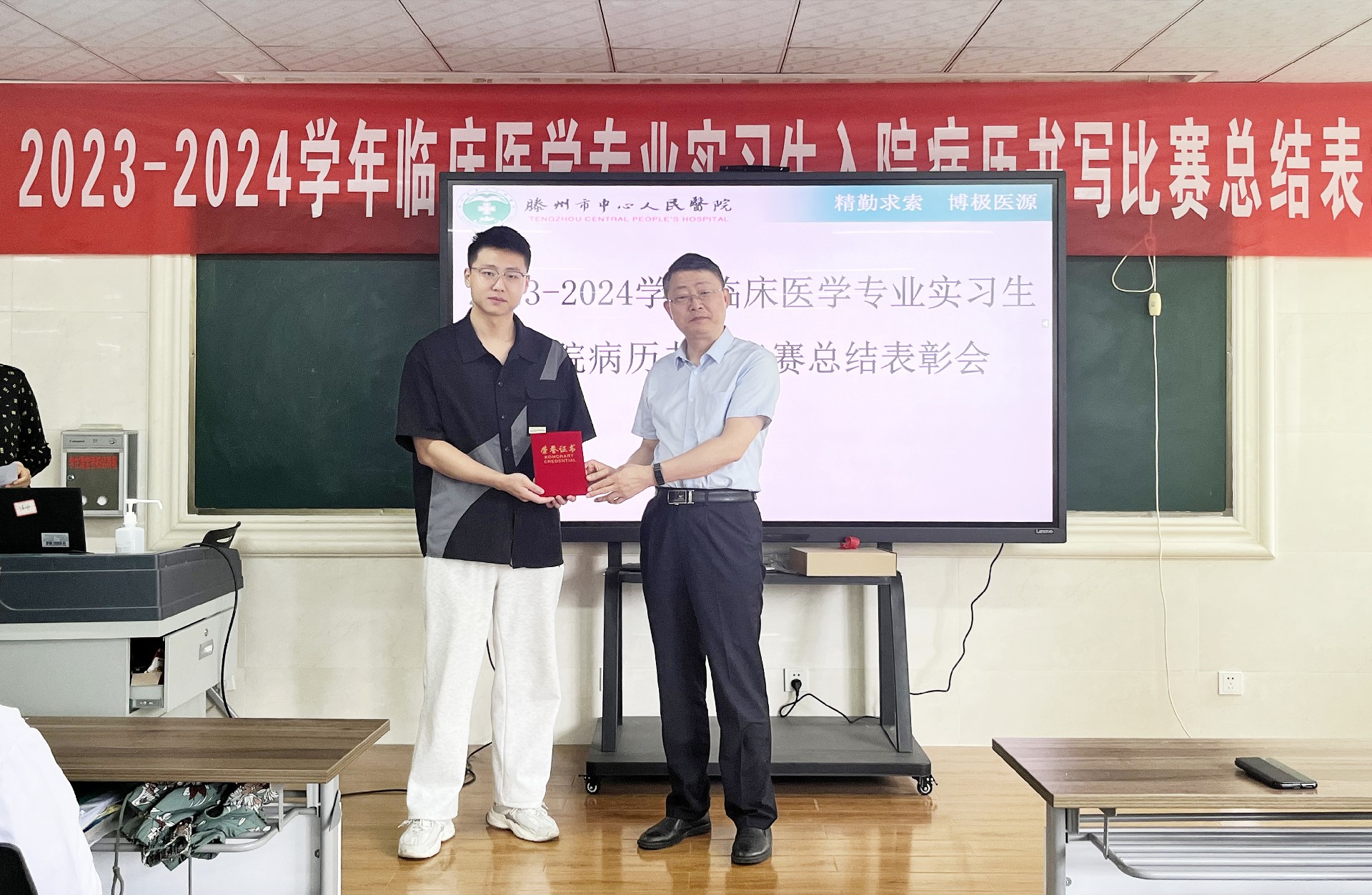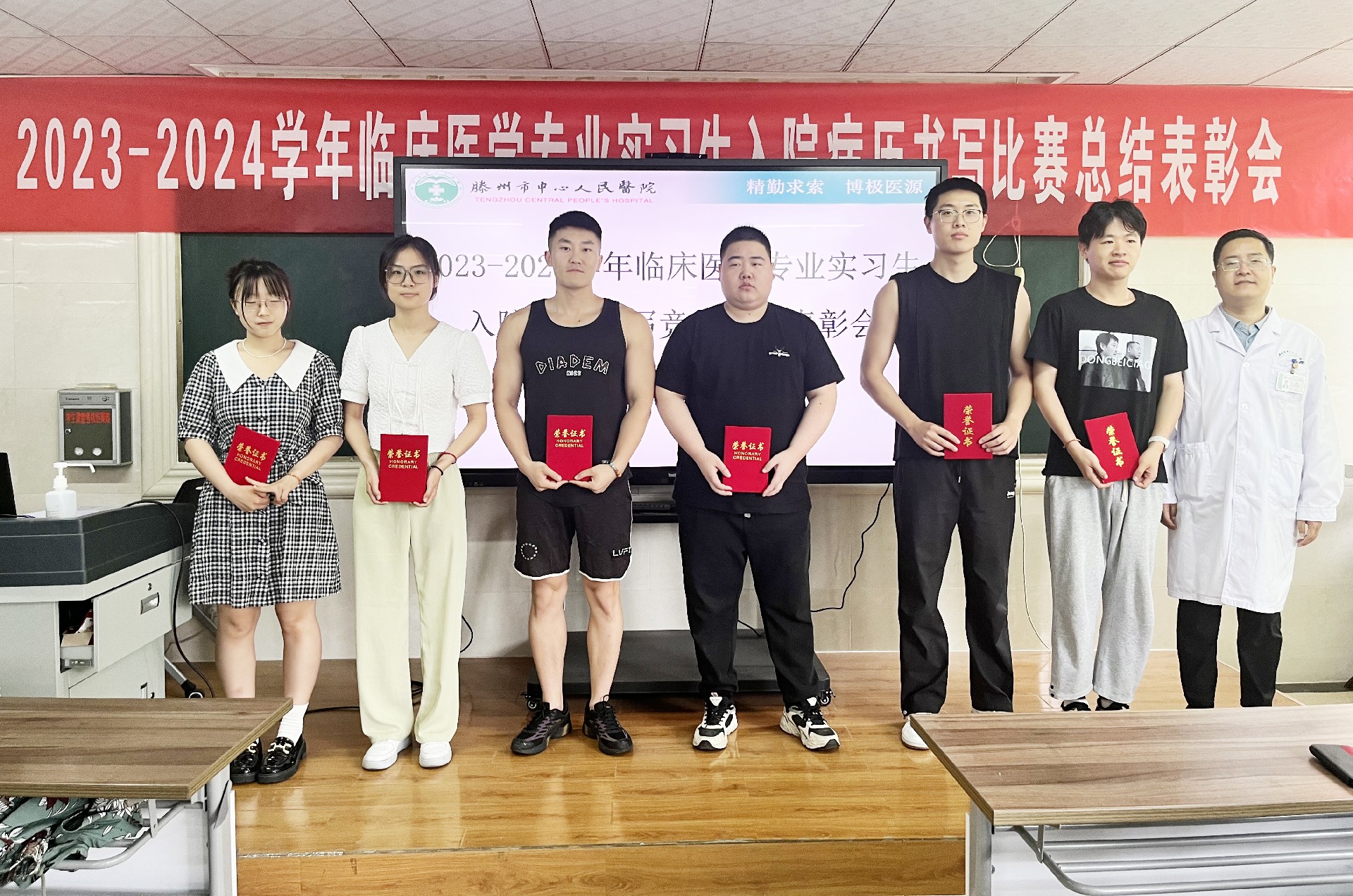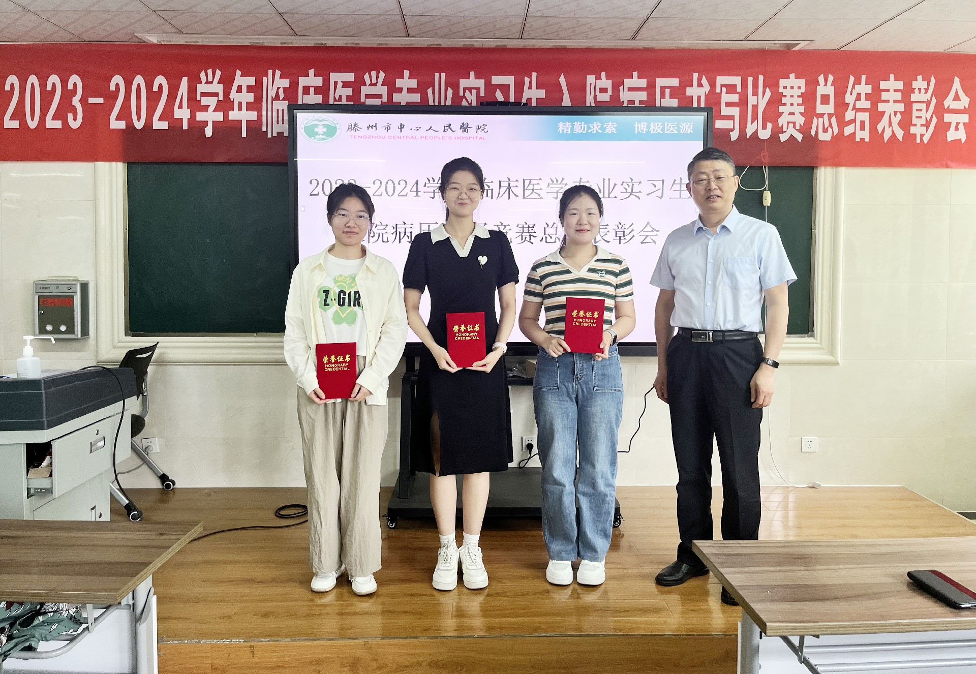 經(jīng)病歷書(shū)寫(xiě)指導(dǎo)教師組代表教師認(rèn)真審閱,最終評(píng)出一等獎(jiǎng)1名、二等獎(jiǎng)3名、三等獎(jiǎng)6名同學(xué),并于6月5日上午召開(kāi)總結(jié)表彰大會(huì)。會(huì)上,副院長(zhǎng)卜廣波和教師代表邱浩為獲獎(jiǎng)同學(xué)頒發(fā)了榮譽(yù)證書(shū)。