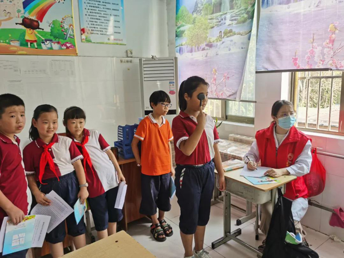 青少年視防中心的丁秀和龍婷走進(jìn)每一個(gè)班級(jí)為100多名學(xué)生進(jìn)行視力檢查,對(duì)于視力異常的同學(xué)及時(shí)與班級(jí)老師溝通,并告知注意事項(xiàng)。她們還規(guī)范指導(dǎo)學(xué)生們做眼保健操以及正確的讀書(shū)寫(xiě)字姿勢(shì),同時(shí)發(fā)放了《中小學(xué)生近視防控手冊(cè)》和“三姿”科普掛圖。