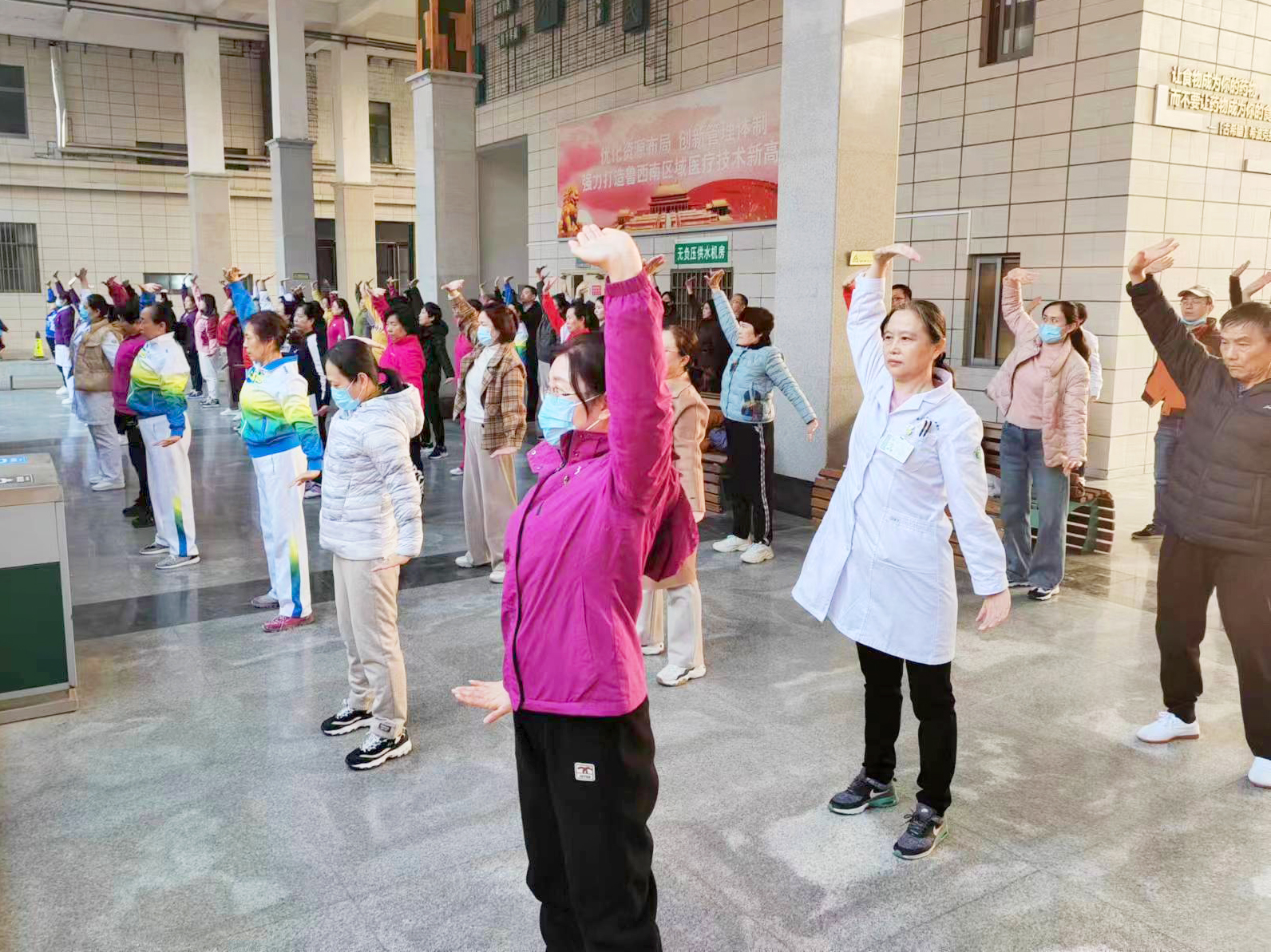 “第一式,雙手托天理三焦”“第二式,左右開弓似射雕”……伴隨著舒緩的音樂和清脆的口令,醫(yī)院八段錦愛好者的每一個動作都有板有眼、舒展和諧。