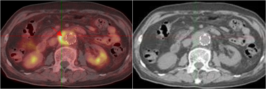 老年男性,反復發(fā)熱1年余;10年前因主動脈夾層行支架植入。PET/CT顯示支架周圍主動脈管壁增厚,代謝明顯增高,診斷為支架周圍感染。