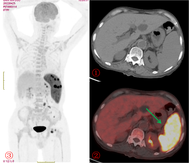 老年男性,發(fā)熱半月,全身CT未見確切異常。PET/CT示脾臟增大伴代謝明顯不均質(zhì)增高(圖2?綠箭),腹盆腔部分略大淋巴結(jié)伴帶代謝增高,診斷為淋巴瘤,病理證實為小B細胞淋巴瘤。