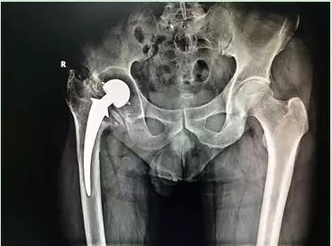 術(shù)前X線:髖關(guān)節(jié)假體已松動,假體周圍大量骨溶解