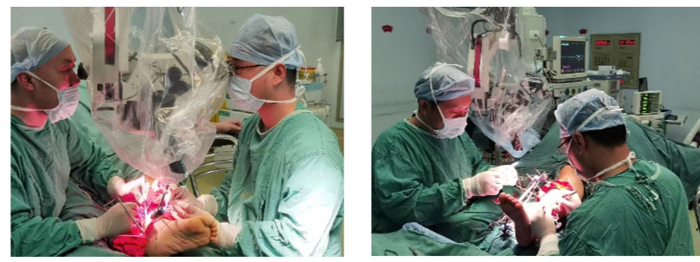 經(jīng)過(guò)積極的術(shù)前準(zhǔn)備,手術(shù)順利進(jìn)行。在術(shù)前預(yù)訂方案指導(dǎo)下,依次對(duì)創(chuàng)面進(jìn)行徹底清創(chuàng)、骨折復(fù)位外固定,吻合動(dòng)靜脈血管(6支)、縫合神經(jīng)、肌腱,關(guān)閉傷口。當(dāng)?shù)谝粭l脛后動(dòng)脈血管吻合后離斷的肢體迅速恢復(fù)了血運(yùn)。手術(shù)由潘維亮主任醫(yī)師、張亞州主治醫(yī)師、段修芳主治醫(yī)師、張俊國(guó)主治醫(yī)師共同參與、交替操作完成。凌晨4:50患者離斷肢體血循環(huán)系統(tǒng)建立通暢,再植手術(shù)順利完成。整個(gè)手術(shù)過(guò)程歷時(shí)7小時(shí)余。術(shù)后遠(yuǎn)端肢體血管充盈良好,顏色紅潤(rùn)、皮溫正常。鑒于手術(shù)時(shí)間長(zhǎng),遂轉(zhuǎn)入ICU行生命體征監(jiān)護(hù)。