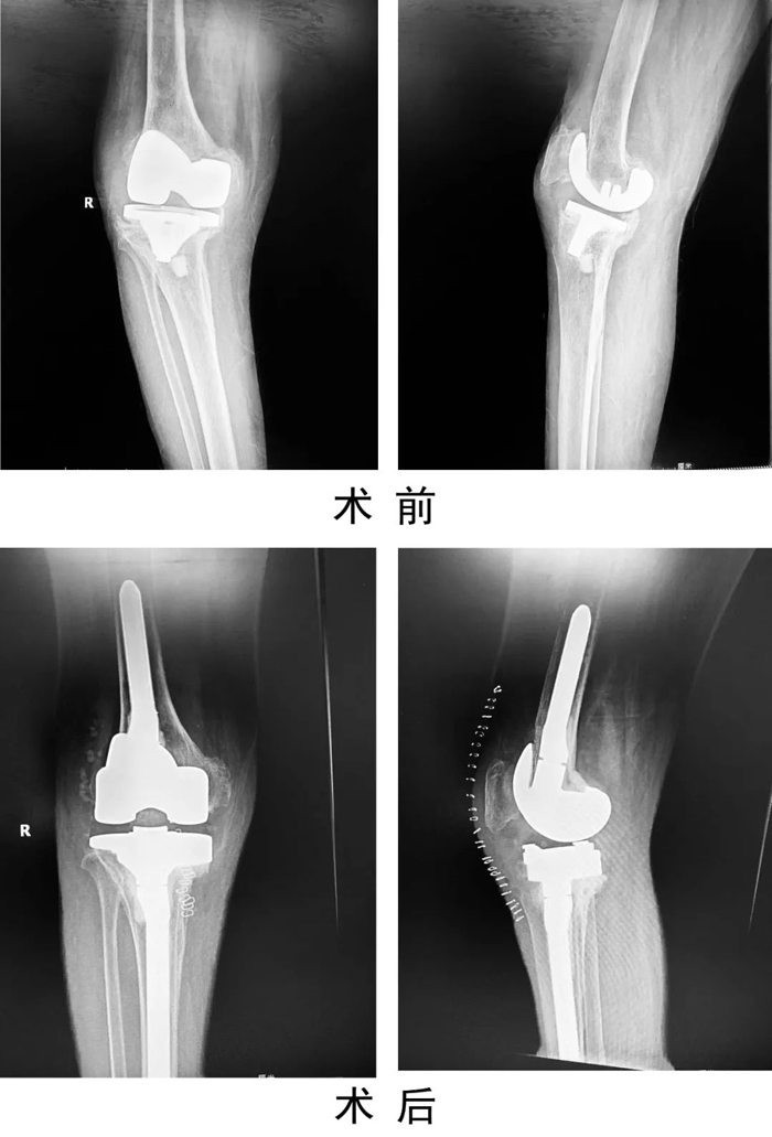 患者入院后,關(guān)節(jié)運動醫(yī)學二科手術(shù)團隊制定嚴密的手術(shù)計劃,為患者實施了一期右膝人工關(guān)節(jié)翻修術(shù),一次手術(shù)清除原假體,徹底清創(chuàng)后,重新植入翻修假體。手術(shù)后患者右膝刀口一期愈合出院,患膝功能良好,疼痛緩解。復查感染指標C反應蛋白4.45mg/L。