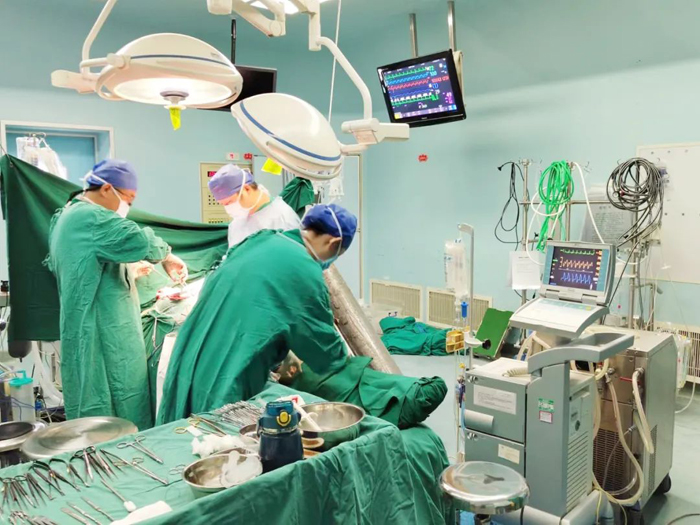柴召強主任介紹,該患者左主干嚴重狹窄,前降支及右冠狀動脈閉塞,心肌缺血嚴重,病變復雜,心功能差,靜脈泵入硝酸脂類藥物效果不理想,手術風險高,我院多學科合作,讓患者在最短的時間內接受手術,有效提高了搶救的成功率。(心臟大血管外科)