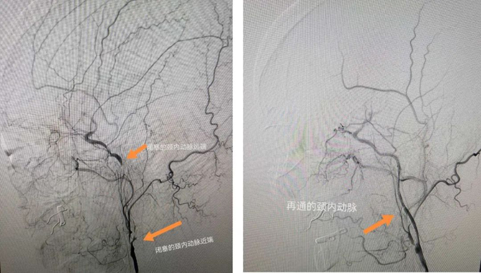 患者3周后來院復(fù)查,行腦血管造影,造影顯示患者左側(cè)頸內(nèi)動脈長段閉塞。與患者家屬溝通后,決定為患者行血管閉塞再通手術(shù)。術(shù)后,患者左側(cè)頸內(nèi)動脈完全再通,而且聽理解障礙和失語恢復(fù)正常!