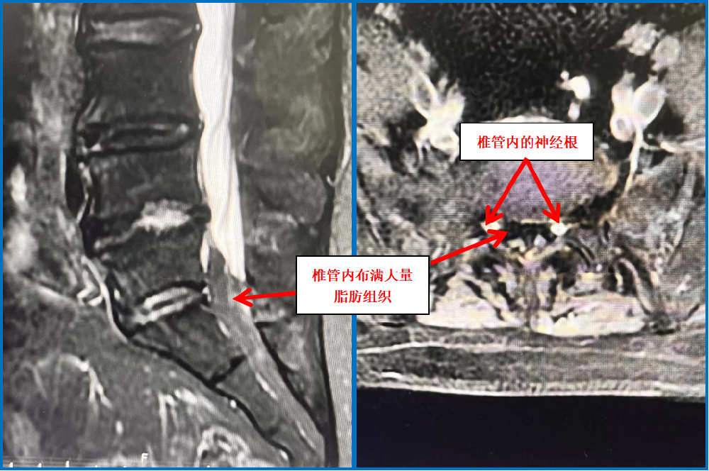 患者經(jīng)他人介紹來到我院脊柱外科門診就診,朱中蛟副主任通過患者的主訴及詳細的查體發(fā)現(xiàn)她存在間歇性跛行的表現(xiàn),腰椎過伸試驗陽性,提示為典型的腰椎管狹窄的臨床表現(xiàn),但通過患者的腰椎CT,卻發(fā)現(xiàn)其不存在腰椎間盤突出或黃韌帶肥厚、骨性增生等情況,不存在腰椎管狹窄。但患者癥狀這么重,肯定有問題!細心的朱中蛟醫(yī)師建議患者完善核磁共振等檢查,發(fā)現(xiàn)她的椎管內(nèi)擠滿了脂肪,導致硬膜囊受壓變形成Y型。