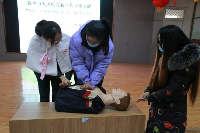 急診科張磊護(hù)士長(zhǎng)帶著兩位護(hù)士,詳細(xì)講解了急救的注意事項(xiàng)。他特別強(qiáng)調(diào),如果遇到此類情形,救人的前題是保證自己安全。張磊護(hù)士長(zhǎng)邀請(qǐng)臺(tái)下的家長(zhǎng)上臺(tái),在醫(yī)院兩位護(hù)士的指導(dǎo)下有模有樣學(xué)起了急救操作。
